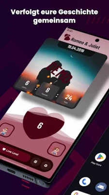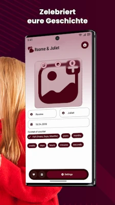 "Love Counter – Beziehungsrechner" bietet weit mehr als nur eine einfache Zeitanzeige. Personalisieren Sie Ihre Erfahrung, indem Sie sowohl Ihren Namen als auch den Ihres Partners hinterlegen. Sofort sehen Sie auf dem Hauptbildschirm, wie viele Monate, Wochen und Tage seit Beginn Ihrer Liebe vergangen sind und wie viel Zeit noch bis zum nächsten Jubiläum verbleibt. Wählen Sie aus verschiedenen Anzeigeformaten – sei es das volle Format mit Jahren, Monaten und Tagen, eine reine Tageszählung oder sogar die Stunden. Ein besonderes Highlight ist das praktische Widget für Ihren Startbildschirm: Es zeigt Ihnen nicht nur auf einen Blick die verstrichene Zeit, sondern visualisiert Ihr "Love Level", das sich langsam füllt, je näher Ihr einem besonderen Jahrestag kommt. So haben Sie Ihre Liebesgeschichte stets präsent und verpassen keinen wichtigen Meilenstein.