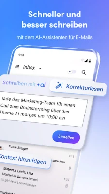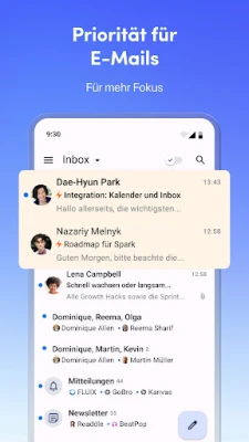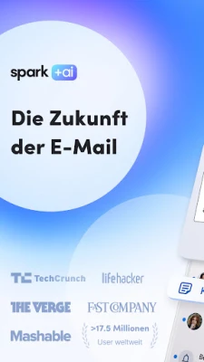 Heben Sie Ihre Produktivität auf ein neues Niveau mit Spark +AI, Ihrem persönlichen intelligenten Assistenten. Formulieren Sie E-Mails schneller und präziser als je zuvor: Geben Sie einfach den Kontext vor und lassen Sie Spark +AI Entwürfe erstellen, Tonlagen anpassen, Texte umschreiben oder Korrektur lesen. Blitzschnelle KI-Antworten ermöglichen es Ihnen, auf Nachrichten in Sekundenschnelle zu reagieren, während Sie stets die volle redaktionelle Kontrolle behalten. Die Smart Inbox sorgt zusätzlich dafür, dass persönliche und geschäftlich relevante Nachrichten prominent platziert werden, während Newsletter und Benachrichtigungen diskret gruppiert werden, für einen stets klaren Fokus auf das Wesentliche.