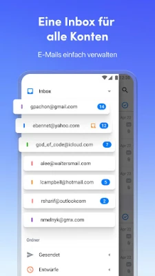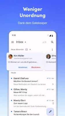 Verlieren Sie sich nicht länger im Chaos unzähliger Postfächer. Spark Mail-App revolutioniert Ihre E-Mail-Verwaltung, indem es alle Ihre digitalen Kommunikationskanäle in einer einzigen, eleganten Oberfläche vereint. Ob Gmail, AOL, Yahoo, Hotmail, GMX, iCloud oder ein beliebiger IMAP-Anbieter – mit Spark gehören App-Wechsel der Vergangenheit an. Genießen Sie eine nie dagewesene Übersicht und die volle Kontrolle über jede Ihrer Konversationen, um Ihren Arbeitsalltag spürbar zu vereinfachen und sich auf das wirklich Wichtige zu konzentrieren. Ein intelligenter Gatekeeper ermöglicht es Ihnen zudem, neue Absender zu sichten und unerwünschte Nachrichten fernzuhalten.
