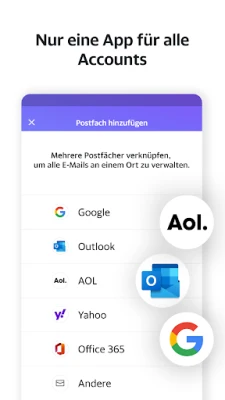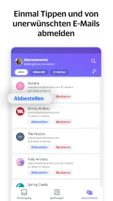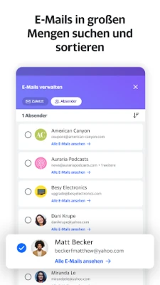 Beginnen Sie jeden Tag mit einem aufgeräumten Posteingang. Yahoo Mail befreit Sie von der Flut unerwünschter Nachrichten und verwandelt Ihr E-Mail-Erlebnis. Nie wieder nach winzigen Abmeldelinks suchen: Mit nur einem Fingertipp organisieren wir all Ihre Newsletter und Werbeaktionen zentral, sodass Sie sich mühelos von störenden E-Mails verabschieden können. Verwalten Sie zudem nahtlos alle Ihre Accounts – ob Gmail, AOL oder Microsoft – alles unter einem Dach, für maximale Übersicht und Kontrolle.